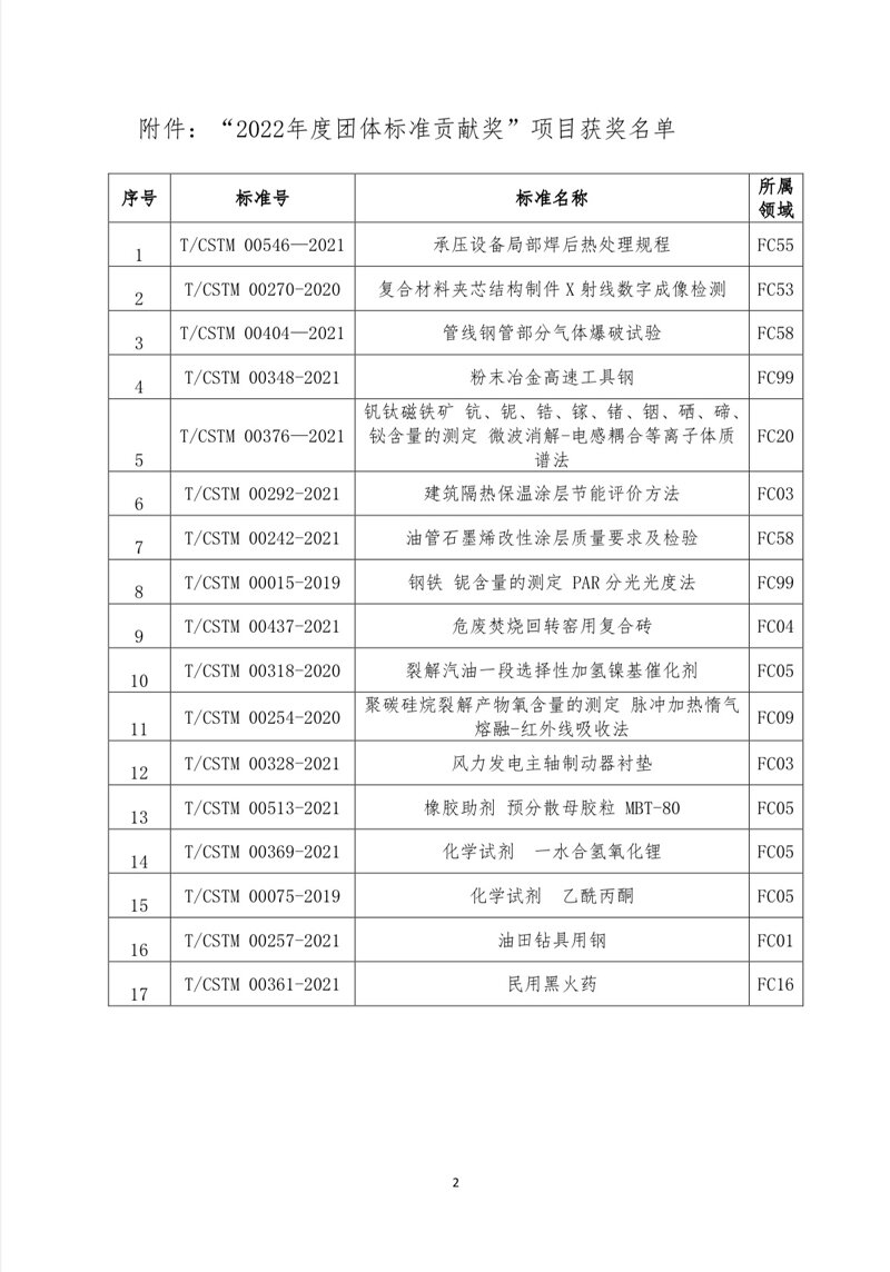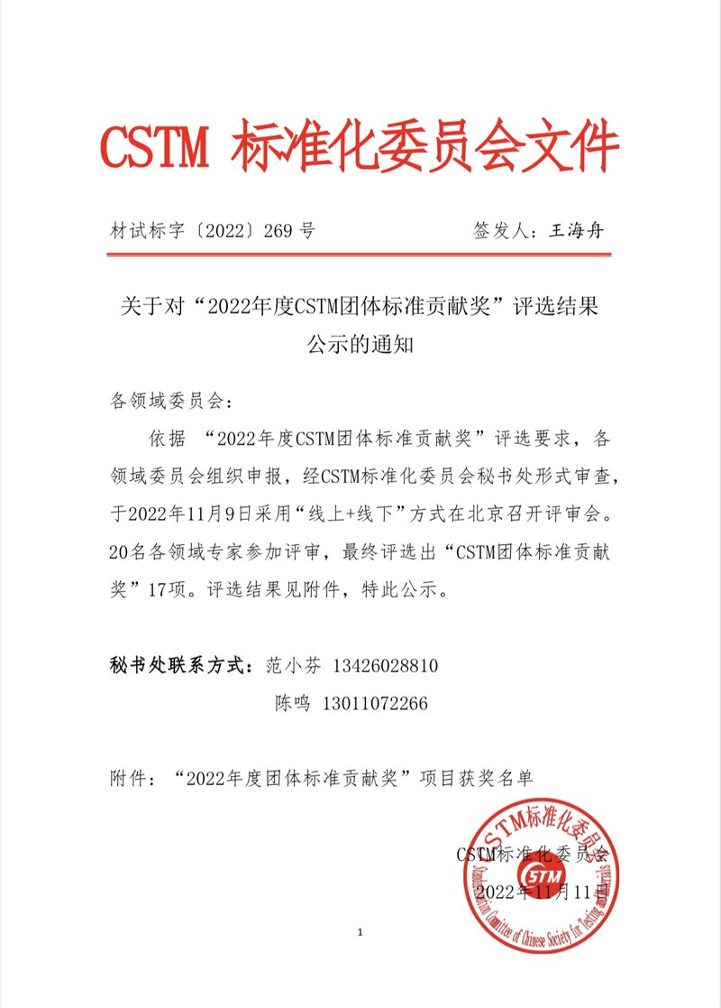 2022年11月11日,經CSTM標準化委員會秘書處審查、20名各領域專家評審,江蘇國豪耐火科技有限公司牽頭制定的團體標準《T/CSTM 00437-2021危廢焚燒回轉窯用復合磚》獲評“2022年度CSTM團體標準貢獻獎”。