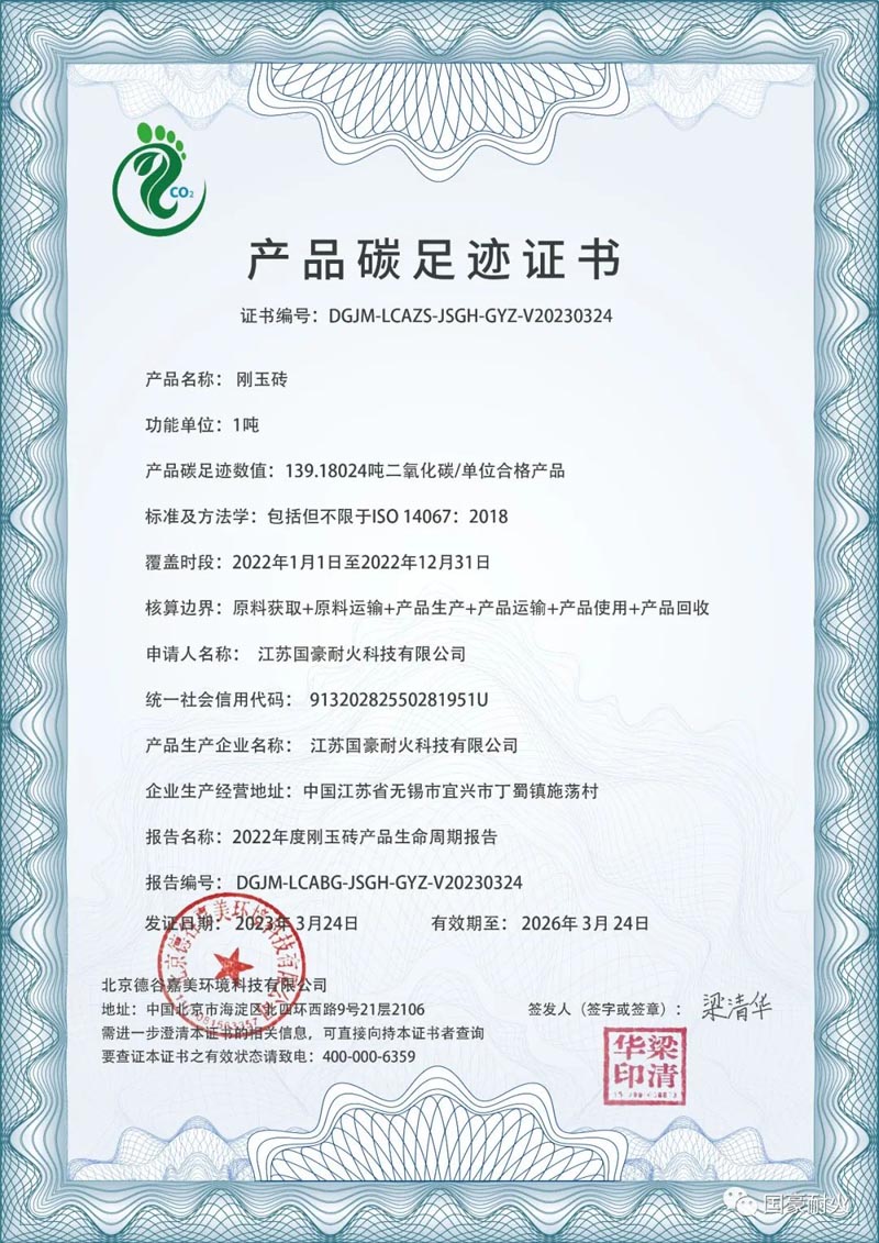 2023年3月,我公司依據標準ISO14067:2018《溫室氣體●產品的碳排放量●量化和通信的要求和指南》,參考《PAS 2050:2011商品和服務在生命周期內的溫室氣體排放評價規范》及《工業其他行業企業溫室氣體排放核算方法與報告指南(試行)》等相關指導文件,對2022年剛玉磚產品生命周期碳足跡進行核算評價,編制了碳足跡核查報告。核算邊界已覆蓋6個階段:生命周期=原材料獲取+原材料運輸+產品生產+產品運輸+產品使用+產品回收。經核算評價,1噸剛玉磚產品的碳足跡為139.18024tCO2。