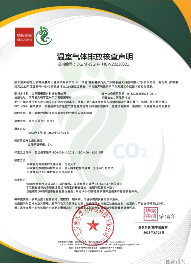 2023年3月,第三方核查機構北京德谷嘉美環境科技有限公司受江蘇國豪耐火科技有限公司委托對其2022年企業溫室氣體排放數據進行核查,出具了溫室氣體排放核查報告。